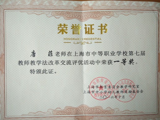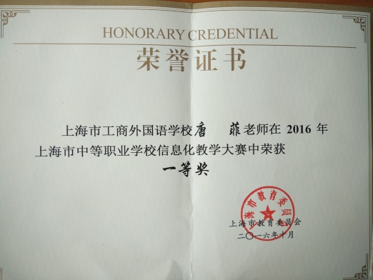 大会还对2016年上海市中职信息化教学大赛的获奖者进行了颁奖,我校唐菲老师再次荣获一等奖。