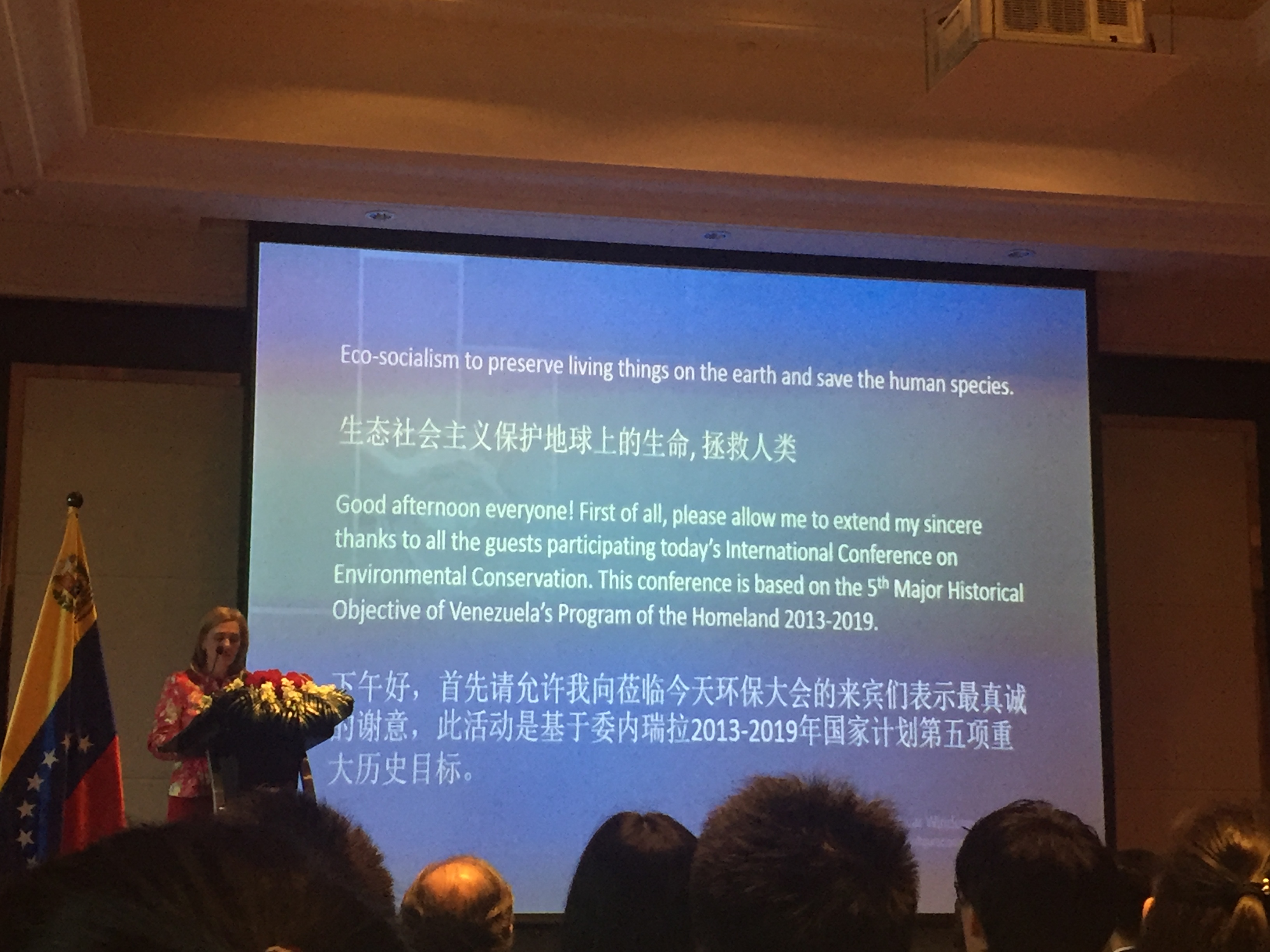 大会分为三个部分,第一部分是由委内瑞拉驻上海总领事莱斯贝斯·克罗莫托·贝里奥斯·莱昂女士(Mrs.Leisbeth Coromoto Berrios Leon)发言,在发言中,总领事强调了委内瑞拉2013-2019年国家计划第五项重大历史目标,这个第五项历史的大目标是号召所有人来一起努力推动全球运动,抵制造成气候变化的原因并恢复因掠夺性和威胁人类的资本主义模式导致气候变化的影响。