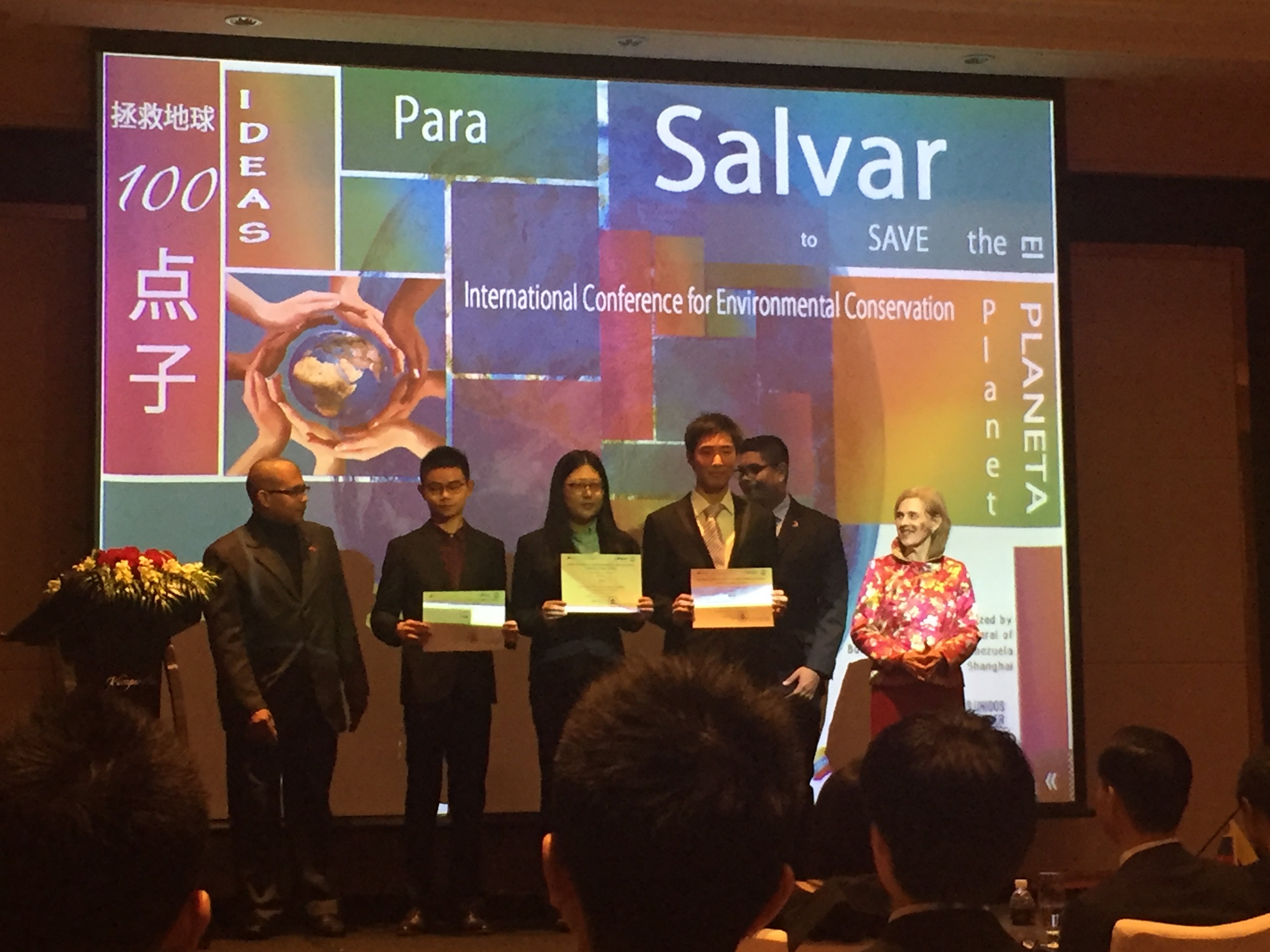 11月21日周一上午, 1517和1418班商务西语专业的16位学生应委内瑞拉驻上海总领事馆邀请出席了在浦东凯宾斯基酒店举行的“拯救地球,保护地球的100个点子”国际环境保护大会。此次大会是基于委内瑞拉 2013-2019年国家计划第五项重大历史目标,旨在征集一切对抗全球变暖以及使遭受恶化的地球恢复原状的解决方案。