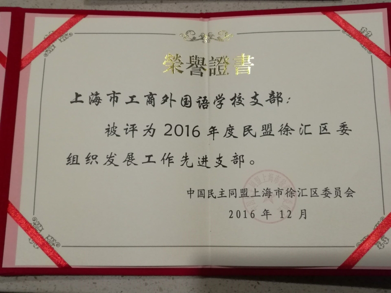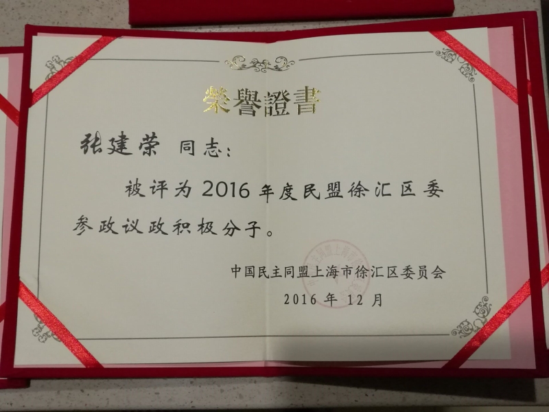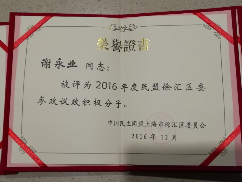 大会表彰了2016年度民盟徐汇区委先进支部和优秀个人。我校民盟支部荣获“民盟徐汇区委综合先进支部”、“民盟徐汇区委组织发展先进支部”,谢永业、张建荣两位老师荣获“民盟徐汇区委参政议政积极分子”。