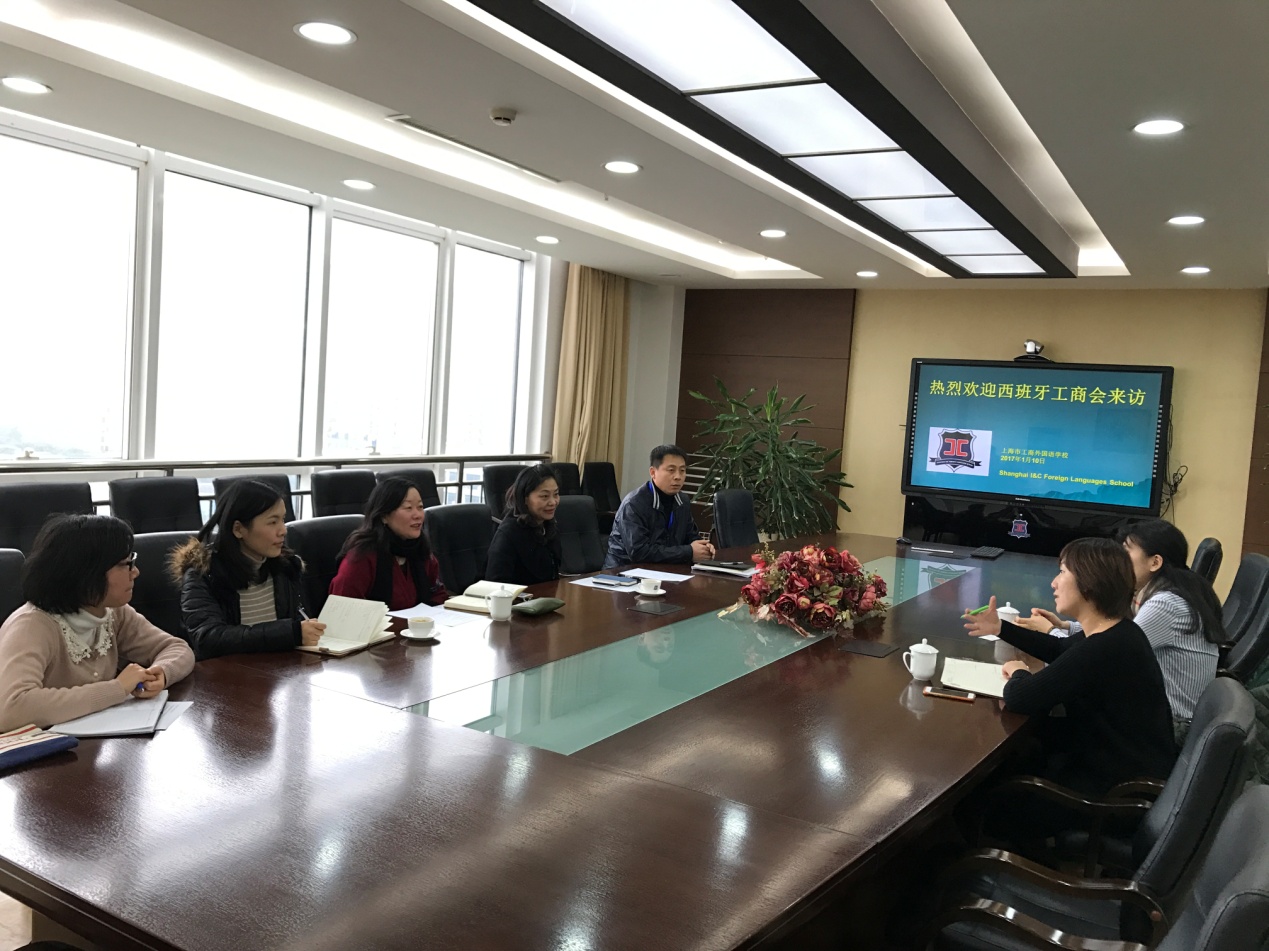 2017年1月10日下午,中国西班牙商会上海分会执行总监任美霏女士、商贸部经理时旭女士来访我校进行合作会谈。我校校长高国兴、党委委员金南辉、商外二部主任杨菁及西语教研组全体教师热情地接待了来访宾客。本次来访是中国西班牙商会上海分会第二次来访我校。