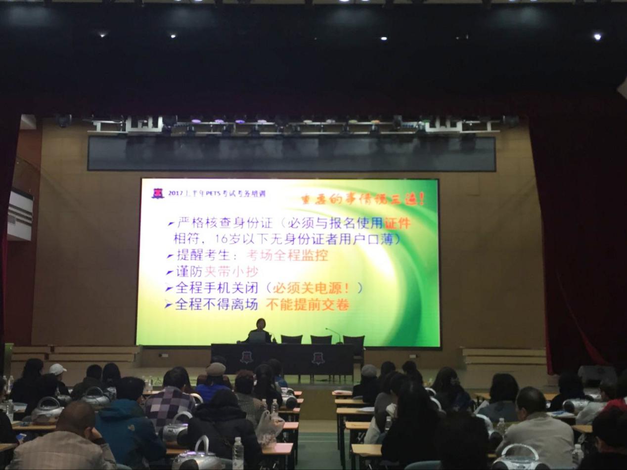PETS(全国英语等级考试)作为一项国家级考试,是教育部考试中心设计并负责的英语水平考试体系,是一项严格按照标准化考试质量要求进行的全国性大型考试。2017年3月18日,我校培训部顺利承办了2017上半年全国英语等级考试。包括笔试、口试共有2370人参加考试,共设考场79个,分布在光华楼、耀华楼、明华楼各教室。