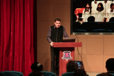 4月11日上午9点,俄罗斯师生还在我校国际部老师的带领下,接受了中国书法与汉服的文化熏陶。10点整,隆重的颁奖仪式在明华楼多功能厅进行。我校商务俄语专业1518班王嘉臣和1620班赵小泠两位同学担任中俄文主持。出席本次颁奖仪式的有我校校长高国兴老师、校长助理金南辉老师、商外二部主任杨菁老师、俄罗斯驻沪总领馆教育领事丹尼斯先生、俄罗斯工商会上海代表处首席代表谢尔盖先生以及俄罗斯塔斯社驻上海代表处负责人伊万先生。来自两国的59名决赛参赛者经过激烈角逐在不同课目中分别获得了金、银、铜奖及一、二、三等奖。我校1518班商务俄语专业学生徐翃以优异的成绩夺得“对外俄语”科目的金牌,1620班商务俄语专业学生王晓栋获得“英语”科目的三等奖。为了表示感谢,组委会代表为参与此次活动付出心血的领导和老师办法了荣誉证书,并与我校高国兴校长交换礼品留作纪念。颁奖仪式后,两国学生还为来宾献上了精彩的节目。俄罗斯塔斯社上海代表处伊万先生对颁奖仪式进行了实时报道,在俄罗斯塔斯社新闻网站第一次出现了我校名称和介绍,这是对我校国际化办学的充分肯定。