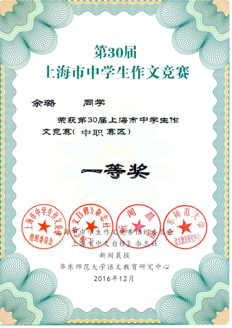 我校高复2班余璐同学在 “中文自修杯”上海市第30届中学生作文竞赛中职组决赛中荣获一等奖第1名。这是我校参加该项赛事以来获得的最高奖。