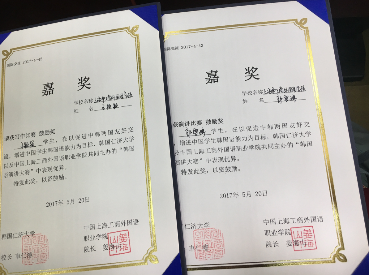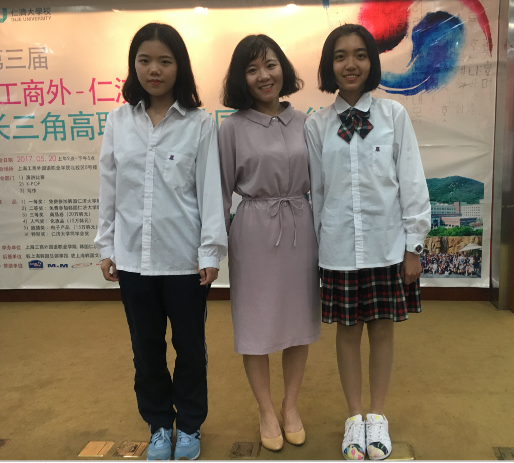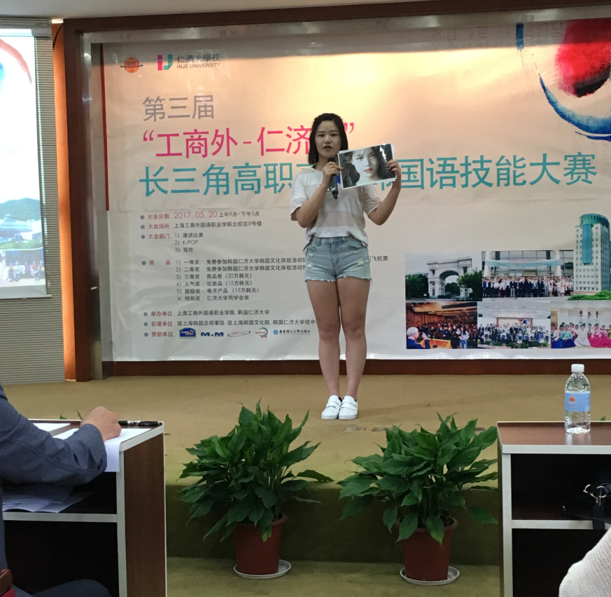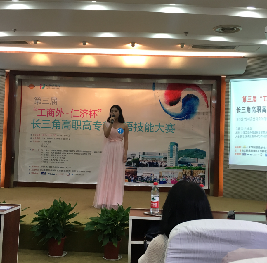 5月20日,我校韩语专业1515班王颖颖、1514班郭雪婷、1616班胡颖梓三位学生参加了由上海工商外国语职业学校与韩国仁济大学共同主办的长三角高职高专韩国语技能比赛,并取得优异成绩,收获颇丰。本次比赛也成为学生提高韩语水平、开阔视野的良好契机。
