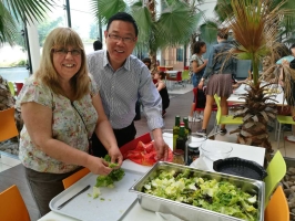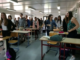 16位中国学生分别进入高二和高一年级由中文老师李老师教授的中文课。中法同学一同“起立上课”。中国学生帮助法国学生学习新课文《“吃喝”在中国》,双方同学各用对方语言介绍自己的学习和生活情况。16位同学还分别在高中教学副校长Lambert女士和其他4位老师的指导下学习:用法语书写文章并用文章画成一幅画(法国文学课内容)、制作法文书法版姓名书签、坚持每天用文字和图片记录学习交流手记、攀岩课、师生共同准备午餐等。法国老师们教地认真仔细,中国学生们学地兴趣盎然。