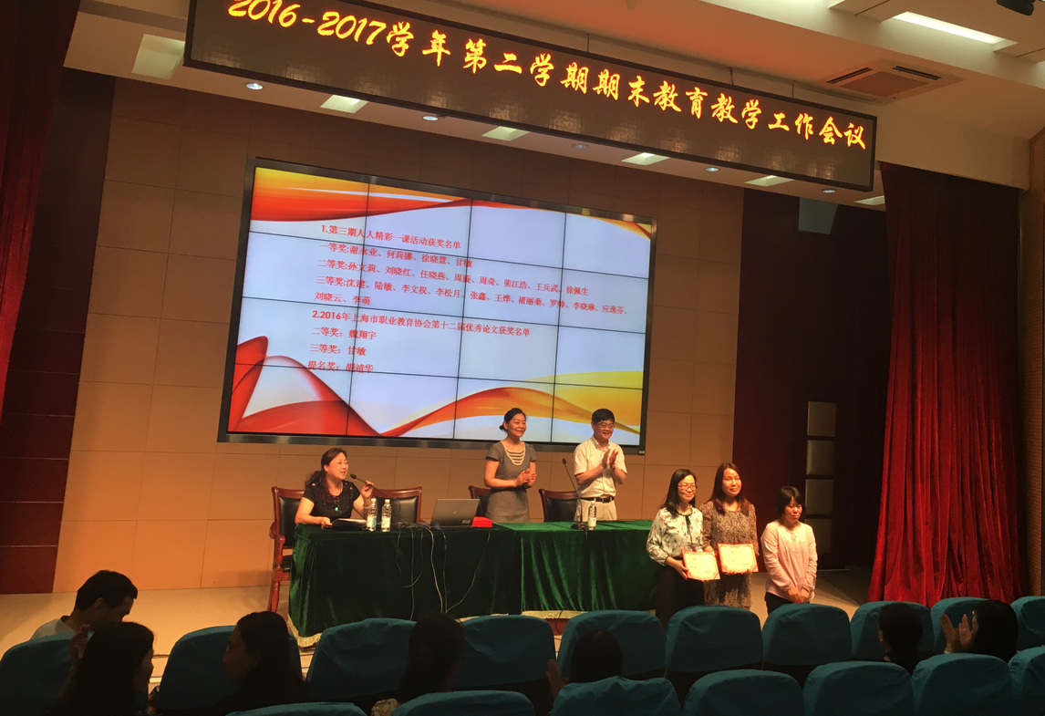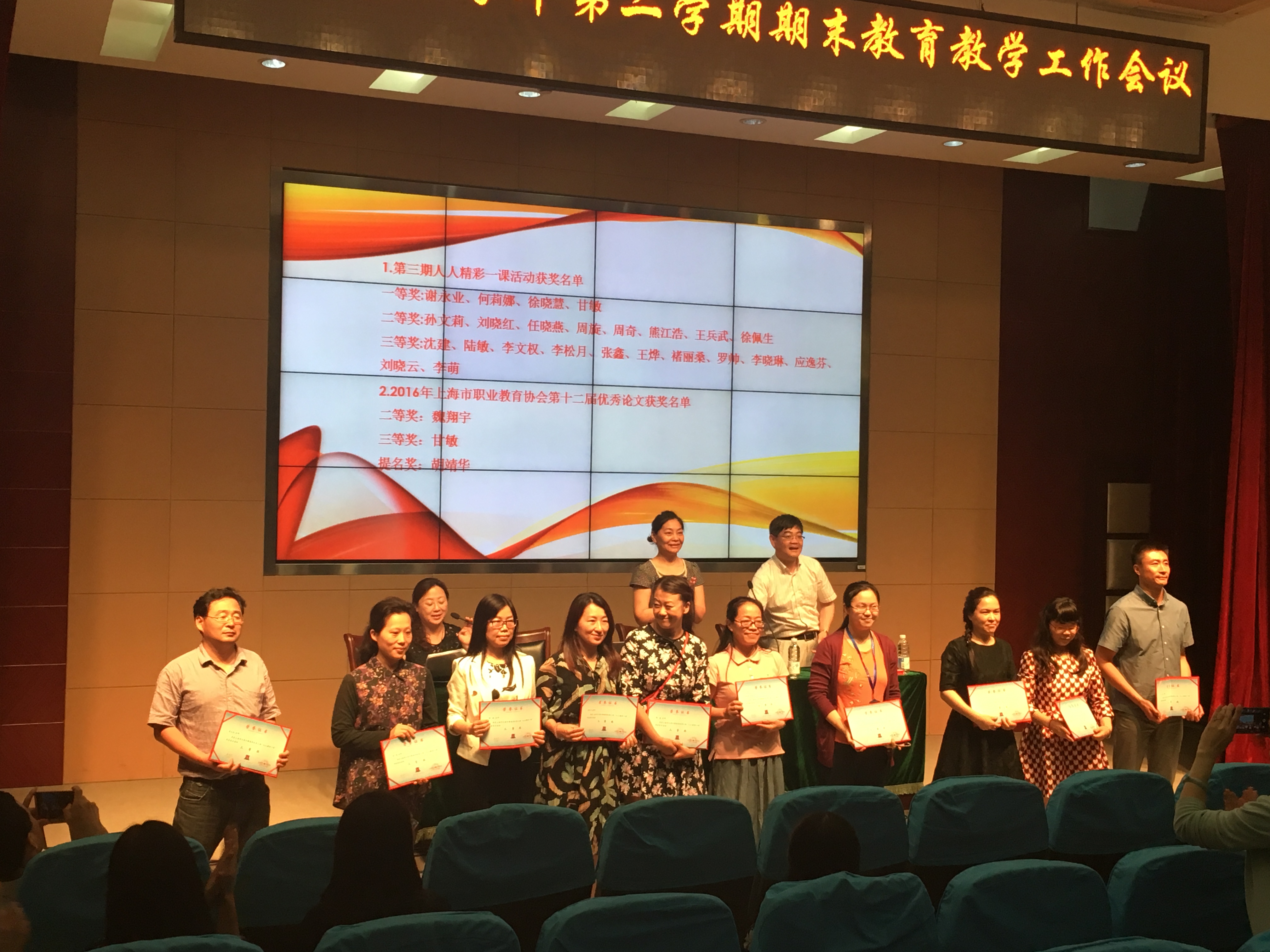 会议的第四个环节,高国兴校长与李红兵书记为第三期“人人精彩一课”的获奖教师以及上海市职业教育协会第十二届优秀论文获奖教师颁奖,充分肯定了他们在教育教学中的成果,同时鼓励所有教师潜心研教,将科研与教学更好地结合。