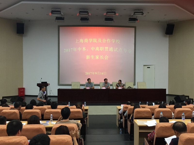 2017年9月14日18:30,上海商学院与我校等七所贯通试点中职校联合召开了2017级中本贯通和中高职贯通新生家长会,各合作院校领导、贯通专业负责人、班主任及350多位学生家长出席会议。