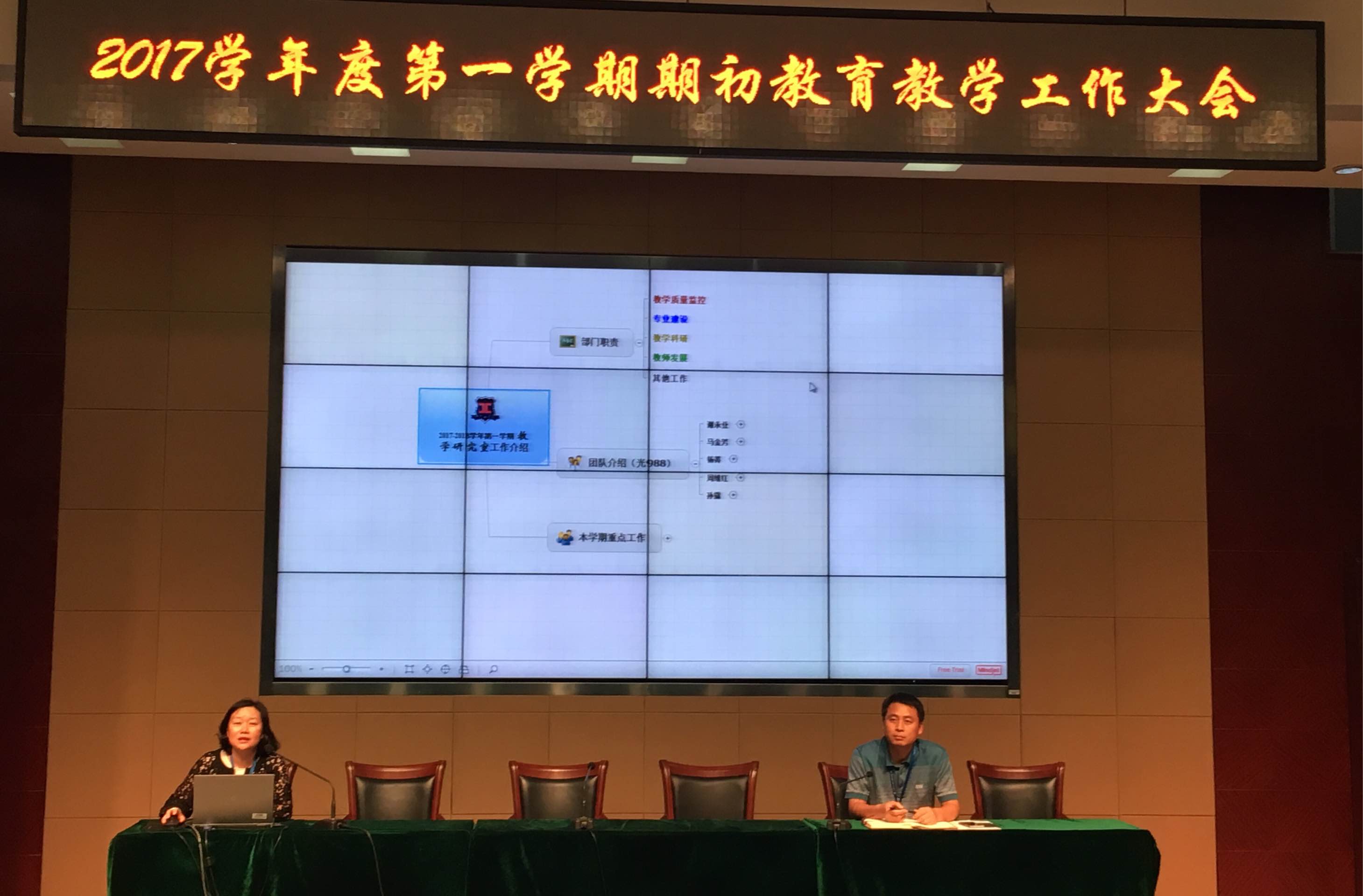 第二个环节是新学期部门工作介绍。杨菁老师介绍了教学研究室的基本情况,包括人员构成以及本学期工作重点。工作重点主要涵盖四个部分:教学质量监控、专业与教研室组的建设、教学科研以及教师发展。