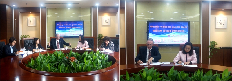2017年10月19日下午,美国威廉杰瑟普大学(简称WJU)副教务长ToddErickson和国际项目办公室TonyQ.Hu一行来我校继续洽谈两校合作事宜,我校陈明娟副校长、办公室主任董曦丹老师、商务外语一部主任何莉娜老师和副主任唐菲老师参加洽谈。