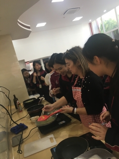 在食堂里,一道道美味又地道的西班牙美食经两位访问学者的指导由学生们呈现了出来,如何做土豆饼不用面粉?怎样能做出西班牙风味的油条?两位访问学者做了充足的准备,从原料、菜单到具体操作一一为我们学生娓娓道来。一阵阵香味甚至吸引了不少食堂阿姨们驻足观看,询问窍门。一盆盆亲手制作的佳肴为学生们开启了新领域的大门,也拉近了中西两国的距离。
