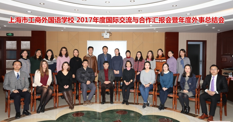 2017年12月14日下午,学校召开了2017年度国际交流与合作汇报会暨学校年度外事工作会议。邀请了来自上海市国际教育交流学会、俄罗斯驻沪总领馆、西班牙工商会、歌德学院、日本横滨市政府上海代表处等单位的嘉宾莅临现场;我校李红兵书记、金南辉副校长以及各教学部和教研室负责人也参加了交流。
