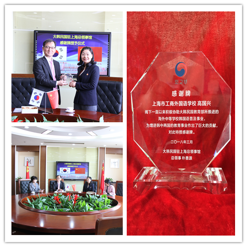 2018年3月12日,大韩民国驻上海总领馆教育领事文泰烈先生专程来访,代表总领事朴善源先生向我校高国兴校长授予感谢牌,高度赞赏高国兴校长一直以来积极协助韩国教育部海外中等学校韩国语普及事业,为增进韩中两国的教育事业做出了重大贡献。