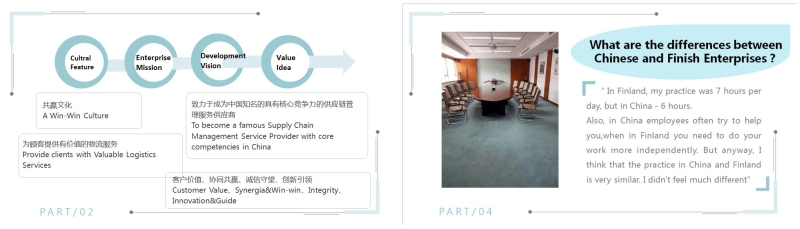 中芬学生联合调研是此次项目的亮点之一。国际教育部着眼于中芬学生伙伴的共同成长,在紧凑的课程中为芬兰师生安排了许多交流活动,跨国企业联合调研便是其一。五周时间里,芬兰学生与中国学生结成搭档开展联合调研,利用空余时间,彼此充分接触,交流实习心得,分享实习感受,共同在闭幕式上汇报了调研成果,内容涉及跨国企业文化、企业核心竞争力、实习经历及感受等诸多方面的内容。