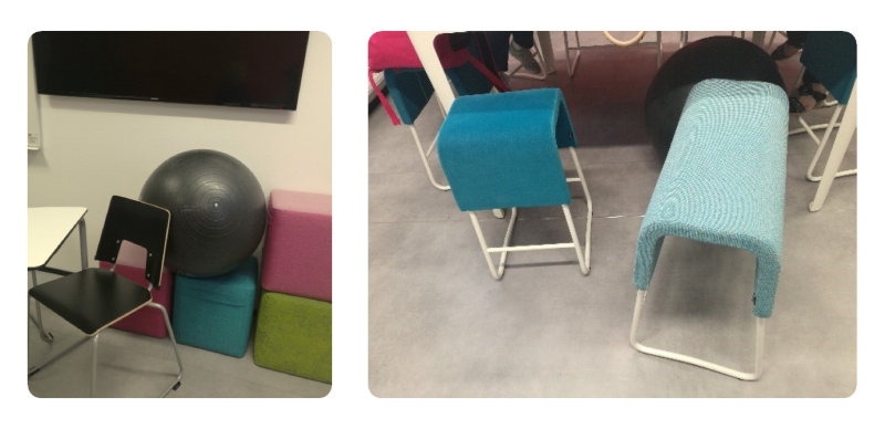 通过和Tampere的对比,我们对于韦斯屈莱有了新的认识,也对于韦斯屈莱的校园产生了新的好奇。校园中大部分教室是相似的,但也不乏造型各异的教室,其中近一半的教室里摆放着不同式样的椅子。Paivi老师介绍说,这是依据学生性格的不同,喜好的不同,身体对于学习环境的要求不同设置的教室设施。例如:不愿一直坐着学习的学生在这里可以借助一个健身球,坐在健身球上上课。一个完整的芬兰课堂是基于大量的讨论和大量的活动而开展的。所有活动均以小组形式进行,教师不断变化活动的内容和方式,教学方式也相当灵活。