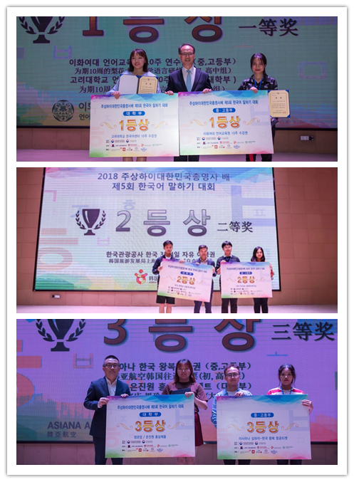 5月26日,由大韩民国驻沪总领事馆与驻上海韩国文化院共同主办,上海市工商外国语学校、高丽大学韩语中心、韩国旅游发展局上海办事处、梨花女子大学语言教育院提供后援,的“大韩民国驻上海总领事杯”第五届韩语演讲比赛在上海市工商外国语学校圆满落幕。大韩民国驻沪总领事朴善源、驻上海韩国文化院院长徐东旭、韩国旅游发展局上海办事处支社长郑容文、上海市工商外国语学校校长高国兴、书记李红兵、上海市教委国际交流处副处长刘江园、复旦大学教授黄贤玉、上外贤达学院教授申昌顺等嘉宾应邀出席大赛颁奖典礼。
