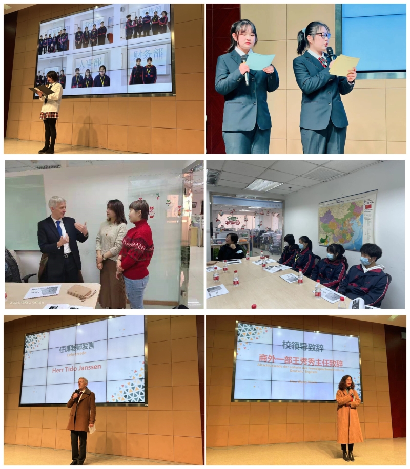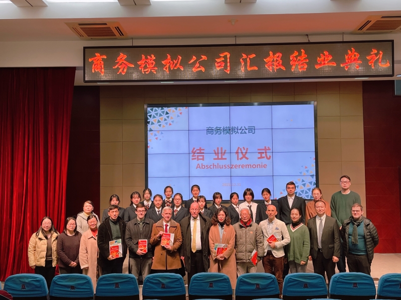 2021年12月31日上午10时,商外一部1905班和1918班的模拟公司结业仪式在明华楼305如期举行。出席本次结业式的有商外一部主任王秀秀老师、副主任唐菲老师及模拟公司的培训师。此外,外事办公室主任刘洋老师、德语教学及研究专家虞龙发教授、德国职业教育专家Dittrich先生、上海巴伐利亚职业培训公司总经理陆黎明博士及市场经理李莹女士也应邀来到现场。