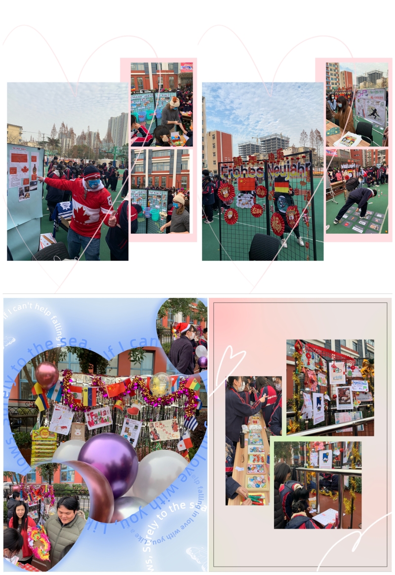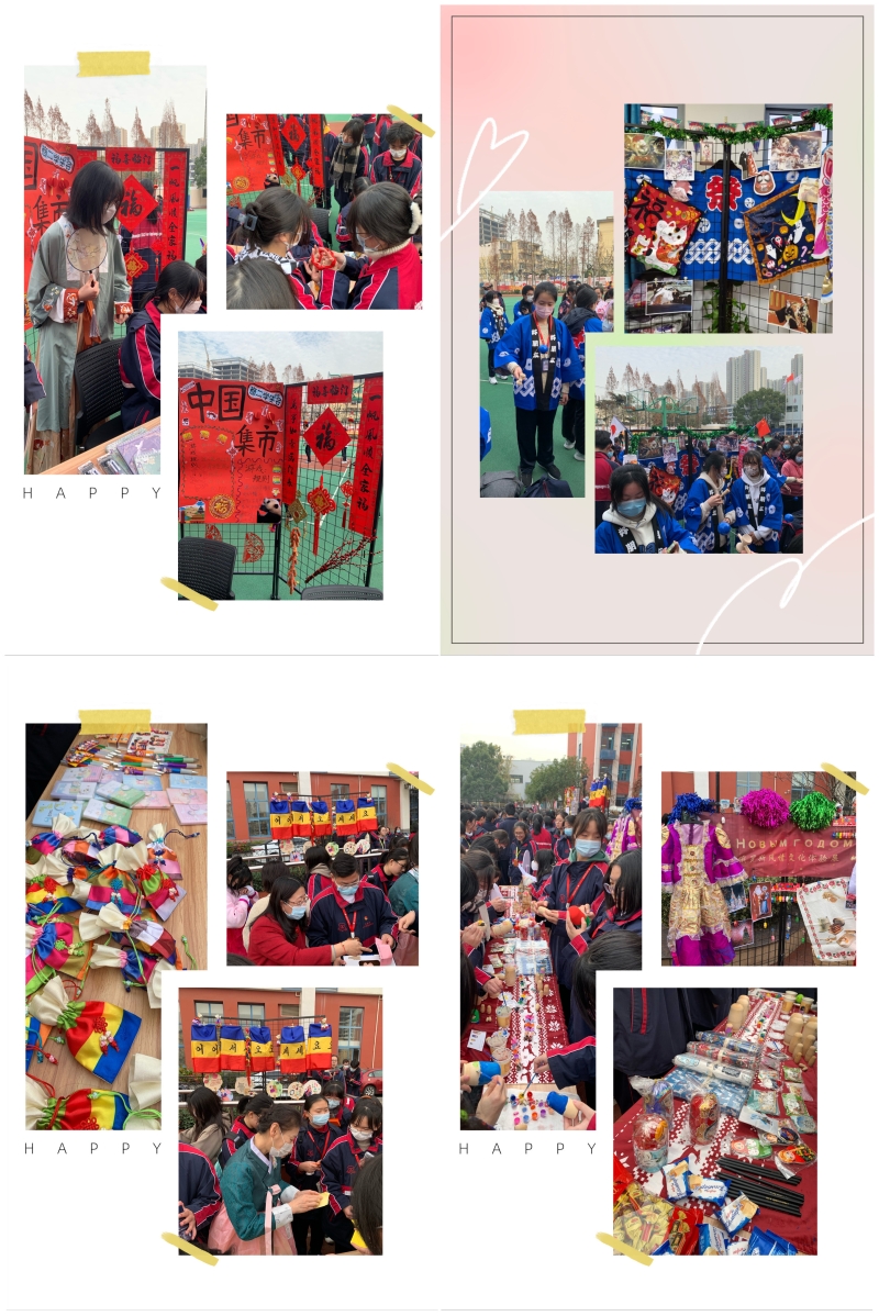 伴随着新年音乐的响起,“新年集市”热火朝天地开张啦!本次新年集市结合上海市工商外国语学校的外国语特色,设置中国、德国、日本、韩国、法国、西班牙、俄罗斯、美国、英国、加拿大、澳大利亚、新西兰等多个国家和地区的风俗展位,各展位在老师和学生志愿者们的精心布置下绚丽夺目,色彩鲜艳的海报、充满异国风情的音乐、精致新奇的小物件、充满年味的对联和灯笼,为学生们营造出一个轻松欢乐的集市会场。同学们可以体验不同国家的特色游戏、精美服装、多样美食,通过欢乐体验,近距离感受各国特色文化,让学生们在走走停停中品味各国新年的民俗风情,感知浓浓的年味儿。同时,各展位还设计丰富多彩的体验活动,全校师生积极参与,学一句外语、玩一次游戏、猜一个谜语、尝一口特色美食、答一个问题,集市场面热火朝天!在中国文化展区身着汉服的中国文化小使者向在场人员介绍中国传统习俗,同学们在这里可以体验到中国传统游戏翻花绳、踢毽子;英语展区由外教带领同学们参加有关英语国家风土人情的知识有奖竞猜、棒球比赛等;德国展区为大家精心设计套套圈、跳跳格等游戏;若想体验传统服饰,可以来到日本、韩国、俄罗斯文化展区;在西班牙展区可以享受到卡片翻翻乐和皮纳塔的快乐;法国展区为大家安排外语名字设计与“跟我说法语”活动。俄罗斯展区的彩绘套娃、日本展区的传统游戏羽子板等让大家流连忘返!