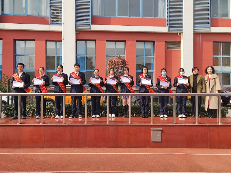 2022年3月3日上午,商一全体学生在操场上参加“十佳商一之星”颁奖仪式。商外一部主任王秀秀宣读表彰决定,杨菁副校长为获奖学生颁奖。