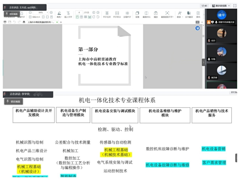 吕冬梅副主任就《上海市中高职贯通教育机电一体化技术专业教学标准》(以下简称《新标准》)开发的背景进行介绍,并针对最新政策要求作简要解读。东海学院机电学院院长助理、机电专业主任李学荣则对两校《修订2022级教学标准的提纲》进行详细汇报。