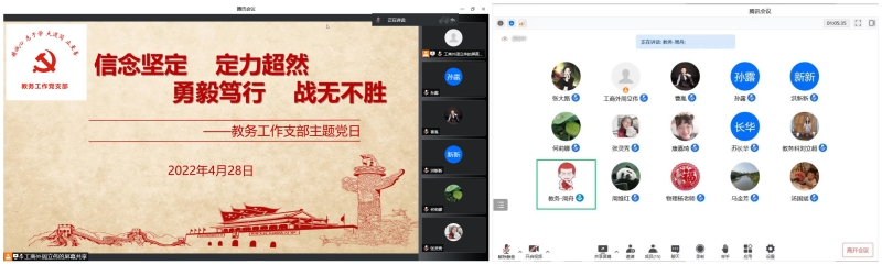 居家办公期间,教务工作党支部的党员同志们在各自工作岗位上坚持不懈地努力工作,积极投身街道社区抗疫工作,取得显著成绩。4月28日下午,教务工作支部线上召开“信念坚定 定力超然 勇毅笃行 战无不胜”主题党日活动,党委委员、副校长杨菁及支部全体党员参加会议,会议由支部书记周立伟主持。此次主题党日活动,旨在凝聚力量,鼓舞人心,给每位党员精神上“补钙”,互相激励鞭策,稳健前行。