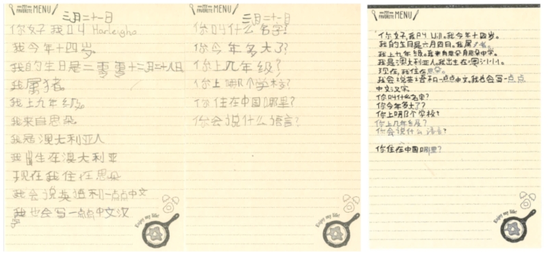 2022年4月,我校国际交流团队ICT的成员们在居家隔离期间同澳洲思朵中学的同学们开展笔友见面活动。第一次的线上破冰交流活动由国际部梁璜老师指导参与,澳洲老师主持。活动期间,澳洲思朵中学的同学们用中文书写自我介绍,还有的同学录制中文自我介绍视频,他们用稚嫩的汉字,简单却真挚的话语向我校同学们送来问候。在收到澳洲同学的来信后,我校ICT的同学们也热情用英语回信,介绍自己的学习生活并送上祝福。