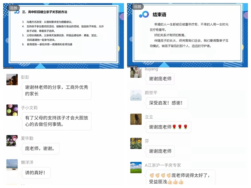 庞老师通过两则亲子关系研究案例和电视剧《小欢喜》中三组家庭为例引入与分析,帮助家长们认识建立和谐亲子关系的重要性,亲子关系的三大核心:需求、平等、承载,高中阶段建立亲子关系的方法等相关知识,引导家长们以积极心态面对孩子成长过程中出现的各类问题,用发展的眼光看待孩子的成长过程,建议家长根据孩子在不同阶段树立不同的培养目标,适时调整亲子互动模式,加强与孩子的沟通交流,让孩子拥有知识应变能力和心理应变能力,正确应对将来社会的各种挑战。