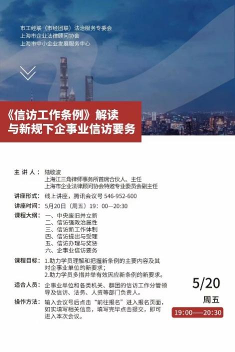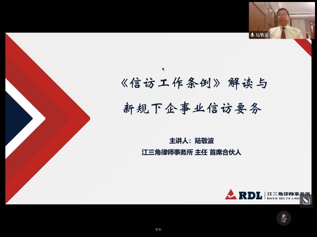 为扎实做好新《信访工作条例》的学习、传达工作,切实奠定解决信访问题、化解信访矛盾、保障信访权益的理论基础,2022年5月20日,校长办公室组织相关工作人员集中线上参加由市工经联(市经团联)法治服务专委会主办,江三角律师事务所主任陆敬波主讲的《<信访工作条例>解读与新规下企事业信访要务》的讲座培训。