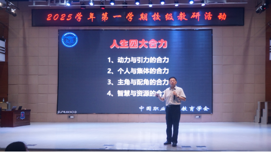 讲座中,结合学校本学期教研主题《新时代职教“金师”的成长路径实践与研究》,邬校长以“怎样当好职教老师”为核心切入点,结合数十年职教管理与一线教学经验,针对学校实际情况,将沉淀40多年的“三要素十维度”育人准则倾囊相授,为教师们清晰勾勒出从“备好课”到“育好人”的进阶路径。正如他在讲座中强调:“职教老师绝非简单的‘教书匠’,要把‘理想、素养、合力’三个要素,揉进每一堂课的细节里。”