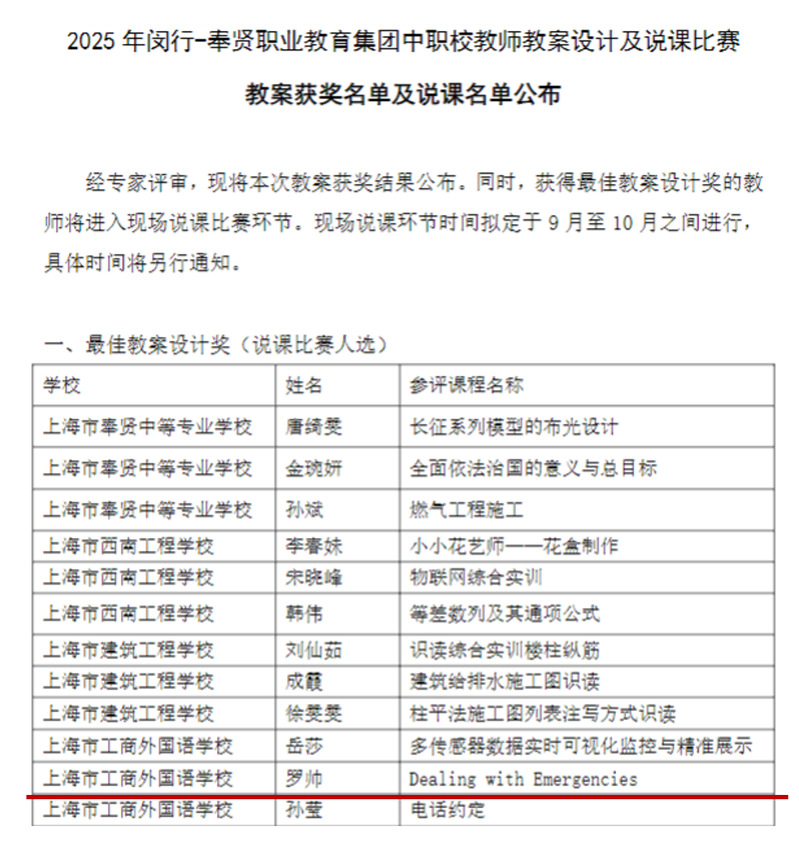 在2025年闵行-奉贤职业教育集团中职校教师教案设计比赛中,国际语言工作室教师团队斩获佳绩。其中,罗帅老师凭借出色的教学设计,荣获“最佳教案设计奖”,并成功晋级下一轮说课比赛;彭向凤老师、胡艺按老师荣获“优秀教案设计奖”,王蔓维老师荣获“优胜教案设计奖”。工作室教师在赛事中的亮眼表现,充分彰显了团队在中职英语教学领域的扎实功底与创新能力。