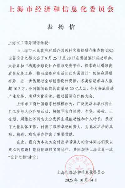 近日,上海市经济和信息化委员会向我校发来感谢信,对我校在2025世界设计之都大会期间的积极参与和大力支持表示高度认可和衷心感谢。