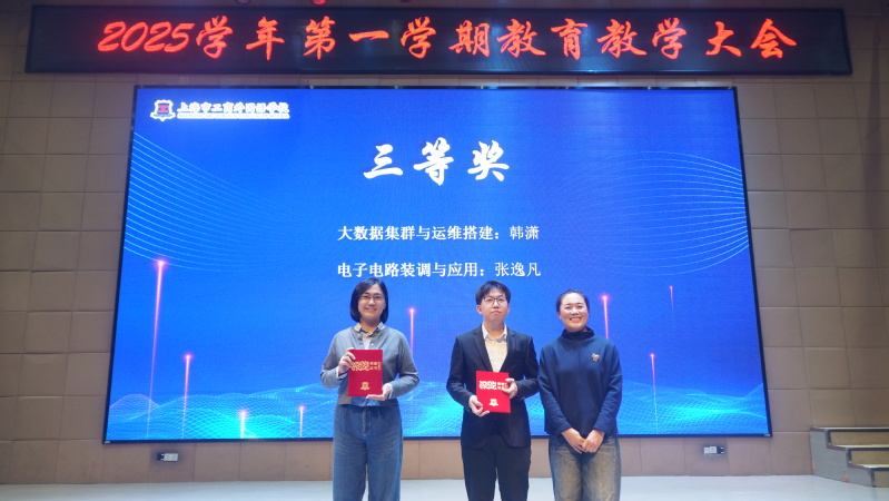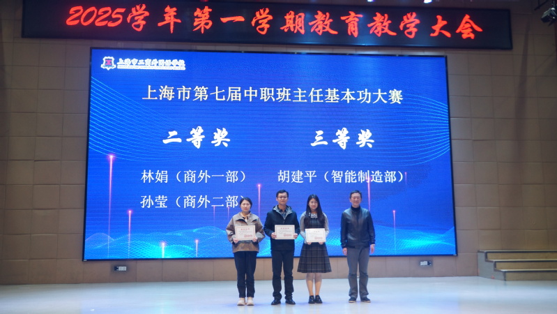 在上海市第七届中职班主任基本功大赛中,商外一部林娟、商外二部孙莹,荣获二等奖,智能制造部胡建平荣获三等奖,这些荣誉也是学校坚持“三全育人”及劳模工匠精神教育理念实践的一份沉甸甸的硕果,为全体教师树立了学习的标杆。本奖项由党委书记王晋为他们颁奖。