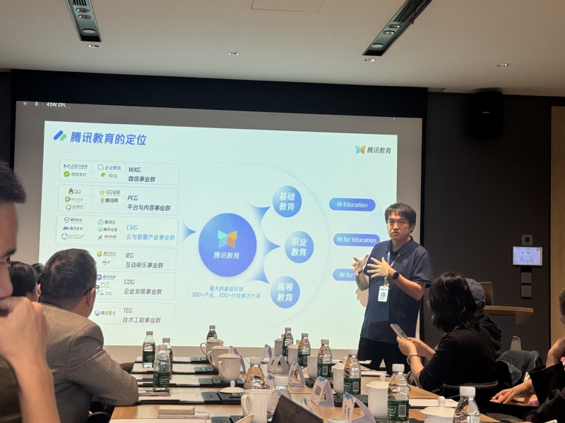 在四楼会议室内,腾讯教育华东地区负责人何明、工程师赵鲁丁、李鑫鑫等接待了学校一行。赵鲁丁详细介绍了腾讯事业分布、腾讯教育、腾讯云的发展情况,重点向老师们推介了腾讯混元大模型、腾讯乐享、超级智能体平台等成熟产品,及各类人工智能技术在教育领域的应用。