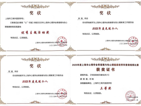 我校一直致力于心理健康教育的创新与实践,通过组织多样化的心理健康教育活动,搭建了学校、家庭、社会和医疗机构多方合作的联动机制,形成了“五育润心,自驱成长”的心育模式。在本次评选活动中,我校《青春征途 解锁“心”可能》心理季活动荣获青春期与性心理健康教育实践基地“优秀主题活动奖”;李艳、何杨两位老师荣获青春期与性心理健康教育“先进个人”称号;何杨老师的微视频《性别刻板印象知多少》荣获青春期与性心理健康教育科普微视频比赛二等奖;申报的课题《中职生性心理健康教育家长课程的开发与实践研究》获得立项。
