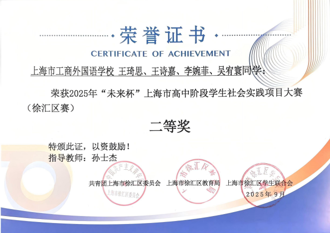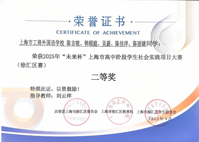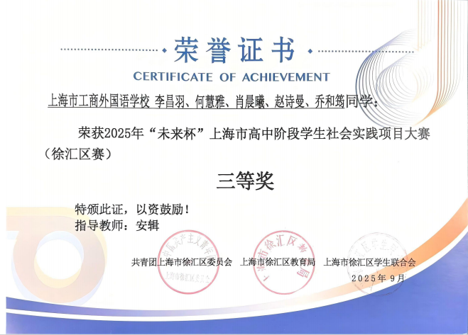 近日,由共青团上海市徐汇区委员会、徐汇区教育局、上海市徐汇区学生联合会主办的2025 年上海市高中阶段“未来杯”社会实践大赛圆满落幕。本次大赛鼓励学生全面贯彻习近平新时代中国特色社会主义思想,围绕全面建设社会主义现代化国家新征程,聚焦国家战略,聚焦上海经济社会发展的重点领域、热点问题,通过社会观察和亲身实践,深入开展社会服务和社会调查,提出解决问题的意见和建议,形成具有现实意义的研究成果,引领高中阶段学生在社会课堂中受教育、长才干、作贡献。