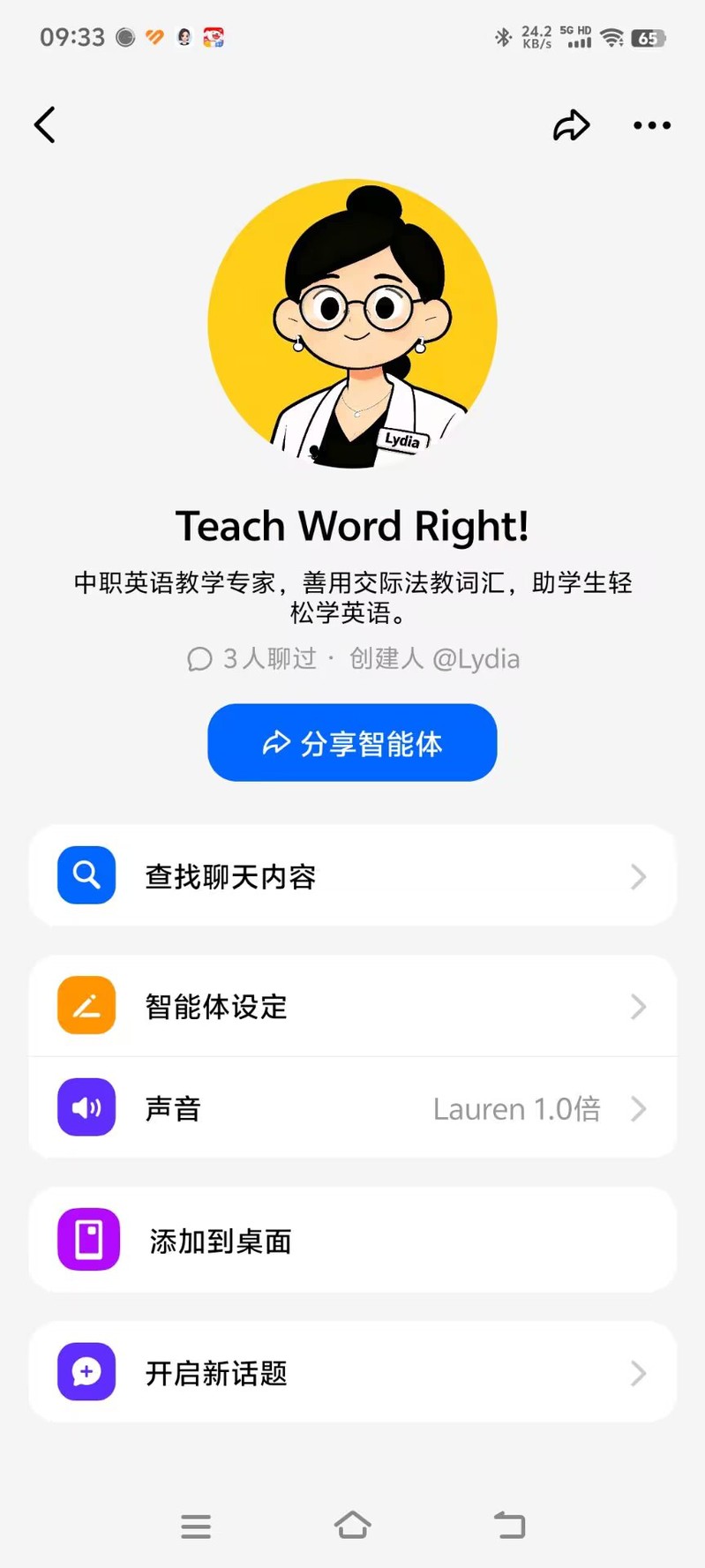 本次教研活动围绕中职英语教学痛点展开,针对学生词汇记忆难、运用弱,教师教学效果不佳等问题,范老师分享了“Teach Right!”“Teach Word Right!”等智能体应用成果。这些智能体可赋能备课与词汇教学,通过精准课堂导入、语境化词汇讲解等功能,贴合教学目标与学生需求。范老师在现场以“appreciate”为例,展示了智能体在读音、词义、用法、易错点等方面的系统教学,融入生活场景例句与开放性提问,践行交际法教学理念。然后,范老师分享了她的词汇教学实践经验,即词汇教学需遵循 “课前精挑、课堂精讲、课后精炼” 原则,通过多次有意义语境接触帮助学生掌握词汇。所有老师们共同研讨了智能体搭建策略与人机协同教学机制,明确教师与智能体的职能边界,推动语言能力与职业素养深度融合。最后,范老师特别提醒各位老师任务驱动在中职英语课堂教学的重要性,即在每堂课的开始就告知学生本次课的任务,让学生的课堂学习能够目标明确,有的放矢。