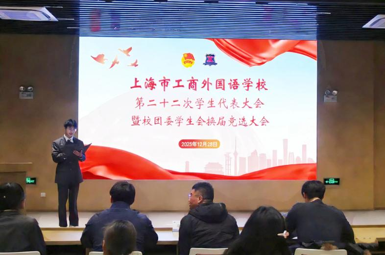 为深化学校共青团建设,凝聚青年力量,筑牢服务根基,我校于2025年12月28日召开上海市工商外国语学校第二十二次学生代表大会暨校团委学生会换届竞选大会。学生科副科长、校团委书记孙士杰,校团委副书记贺海川,教工团支部书记安辑,学生科教师杨钰梁及全体校团委委员、各教学部学生会主席团和各教学部学生代表参加本次会议。