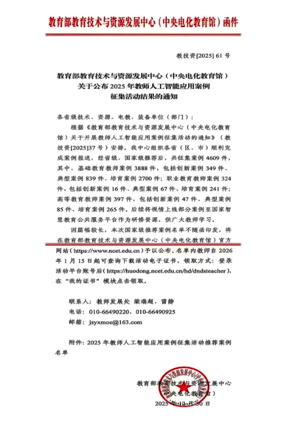 近日,教育部教育信息化技术标准委员会(中央电化教育馆)公布了 2025 年全国人工智能应用典型案例评选结果,由我校谢永业劳模创新工作室暨名师孵化工作室学员、国际语言名师工作室主持人范丽迪老师研发的《沉浸创演体验、聚焦深度理解》案例,成功入选2025 年全国教师人工智能应用典型案例。