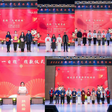 活动期间,还举行了2026年“一日捐”捐款仪式,传递了工商外大家庭的温暖,同时对获评2025年度“文明班组、文明岗位、文明职工”的2个工会小组和8位教职工进行表彰,学校领导还为本命年的老师送上新年礼物和祝福。
