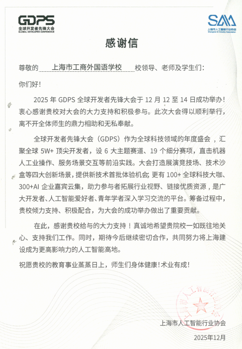 近日,上海市人工智能行业协会发来感谢信,对我校师生在2025年GDPS全球开发者先锋大会中的大力支持表示诚挚感谢。