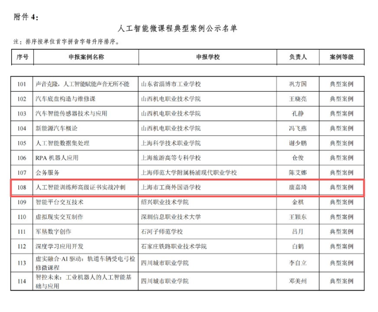 近日,教育部职业院校信息化教学指导委员会公布了人工智能应用典型案例遴选结果,学校康嘉琦老师开发的《人工智能训练师高级证书实战冲刺》微课程,成功入选“人工智能微课程典型案例”,并在官方网站公示。