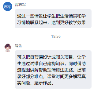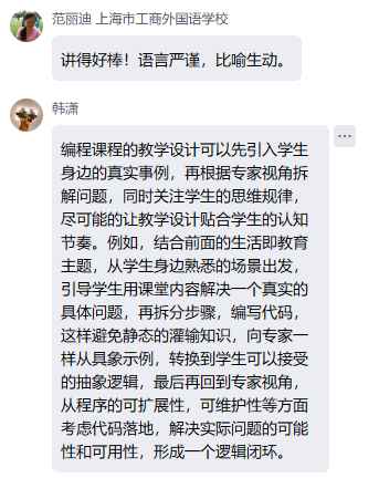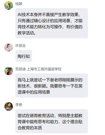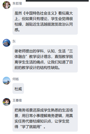 在讨论环节,与会教师踊跃发言,大家结合各自学科分享实践感悟。范丽迪老师提出任务驱动有助于学生理解学习价值,并计划尝试将AI技术引入英语课堂教学;张卫慧老师建议以学生熟悉的生活情境导入学习任务,促进知识建构与问题解决;岳莎老师指出工科教学需注重生活化场景的引入;王术源老师计划将任务驱动理论应用于语文应用文写作教学;桂颖老师认为AI技术需在精心设计的教学场景中才能发挥实效;李艳老师希望将融合理念迁移至德育教育活动;朱哲璞老师强调课程案例应贴近学生生活实际;姚大东老师指出融合理念直击教学痛点;王蔓维老师关注了将商务场景还原为生活情境;曹志军老师倡导通过情景设计连接生活与学习;薛金老师建议将课程设计为闯关式项目来优化学生学习;甘敏老师分享了语文教学中融合逻辑的具体做法;韩潇老师介绍了编程课程的教学设计思路等。