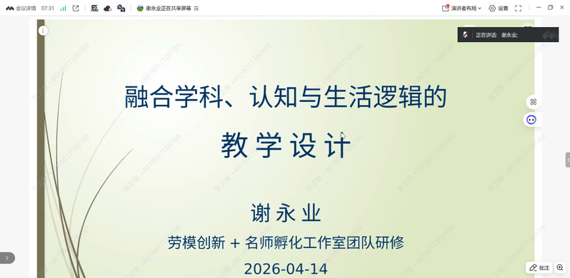 2026年4月14日晚,谢永业劳模创新工作室暨名师孵化工作室(第二期)研修活动在线上圆满举行。本次活动以“融合学科、认知与生活逻辑的教学设计”为主题,由全国模范教师、上海市劳动模范、上海市教书育人楷模谢永业老师主讲,学校名师工作室主持人及学员共同参与。大家齐聚云端,聚焦教学逻辑的深度融合,探索数智化背景下课堂教学设计新路径。