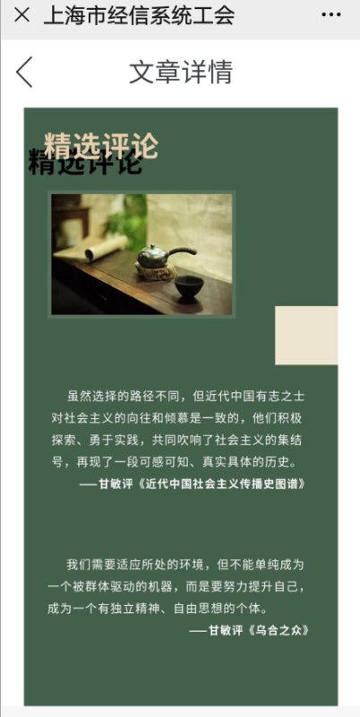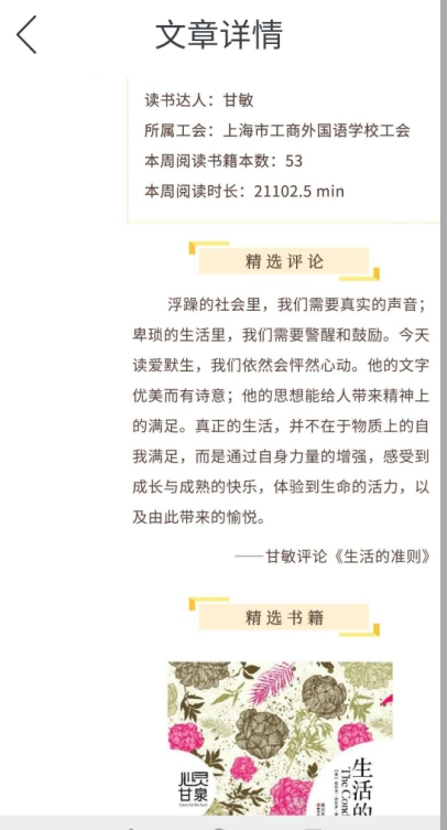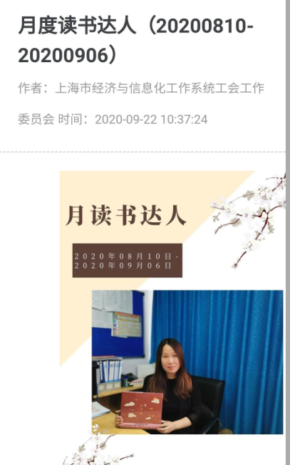 2020年6月中旬,上海市经信委工会2020年职工读书系列活动之一——线上读书活动正式上线。该活动围绕“四史”教育、经管励志、抗“疫”知识、人文社科、家庭教育、听书精选等主题推出经典电子书库,经信委系统内职工完成线上读书社区微信实名认证后,可免费阅读。后台调取个人用户阅读书籍时长、阅读本数、撰写读书感悟等数据,结合个人用户和所在单位活动期间的累计积分排名情况,定期对用户读书情况进行排名,评选出每周和每月“读书达人”,通过“活动风采”栏目,展示他们的风采。