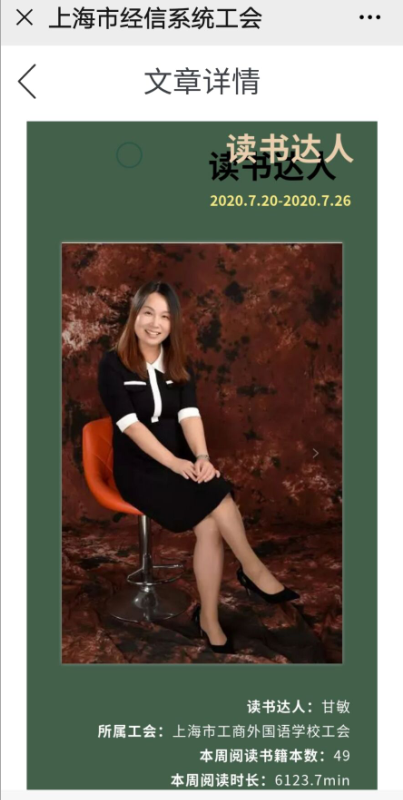 在校工会的倡导下,我校教职工参与了经信委工会的这项读书活动,尤其我校“知道读书社”的成员,更是积极踊跃且坚持不辍。在每周读书达人榜中,我校甘敏、苏长华两位老师分别获得第六周和第十三周“读书达人”称号,更为可喜可贺的是甘敏老师又荣获了8月份月度“读书达人”称号!