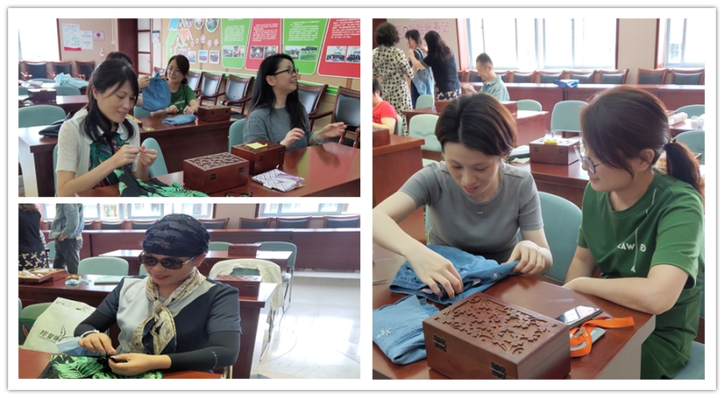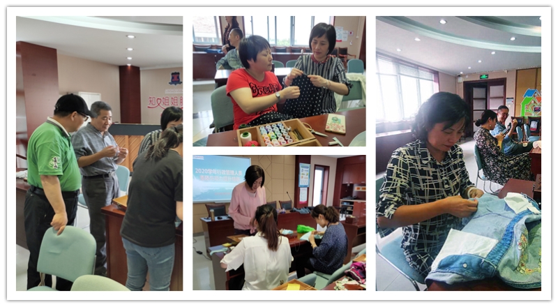 培训结束时,学员们手中的材料也已初见雏形:牛仔半身裙、斜跨布包、保温杯套、束口收纳袋等,待三期课程培训完毕,一件件精美的小物件必将通过旧物改造,布衣生花。行政管理人员在寓教于乐中进一步感受到勤俭和环保的魅力,缓解了工作压力,提升了内涵素养。