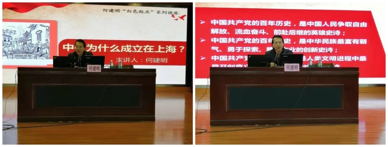 何建明同志首先分析了中国共产党成立前的时代大背景,阐述在上海成立中国共产党的四个选择:历史的选择,阶级的选择,地域的选择,时代的选择。上海当时是远东笫一大城市,百万产业工人聚集地,进步知识分子聚集地,远东的经济中心和人气最旺的城市,所以中国共产党选择上海作为诞生地是历史必然的选择。