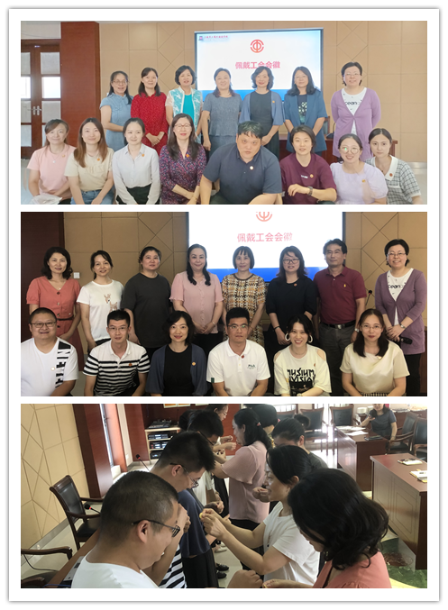 座谈会上举行了工会会徽佩戴仪式,老一届工会委员、女职工委员会委员、经费审查委员会委员、工会组长郑重地为新一届委员、新任工会组长佩戴了工会会徽,大家亲切握手,互赠寄语,祝福鼓励。