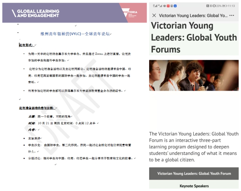 应世界名校墨尔本大学和澳大利亚维多利亚州教育部之邀,我校与上海甘泉外国语学校、上海实验学校以及重庆、成都等地多所知名外国语学校,将于10月21日参加由中方院校和墨尔本大学亚洲教育基金会共同设计,中、澳、印度、印尼等多国青年共同参与的“维州青年领袖营(VYLC)—全球青年论坛”。我校国际教育部派出ICT优秀学生代表,投身于前期的筹备工作。为帮助同学们更好地参与本次活动,国际教育部组织相关师生召开了数次筹备会,积极推进相关工作。