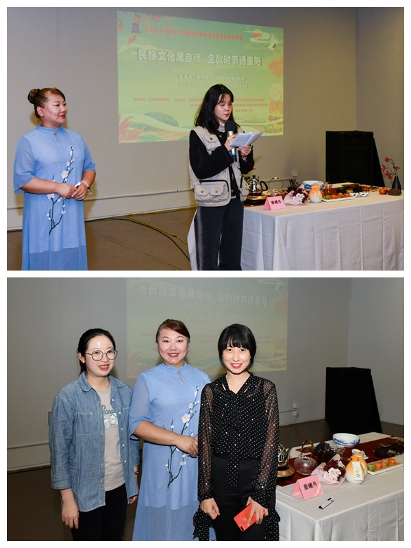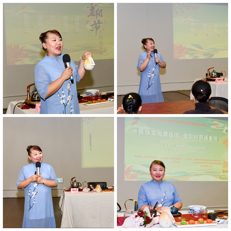 董老师从神话传说、名称、起源与历史发展和民间习俗等多个角度对重阳节进行了全面的介绍。带领大家赏析和品味与重阳节有关的古诗和音乐。在“礼仪与文化”工作室成员、学生科孙慧玲老师的协助下,董老师把真实的重阳习俗带到了现场,让大家身临其境地体验了重阳节的传统习俗。
